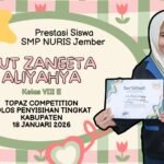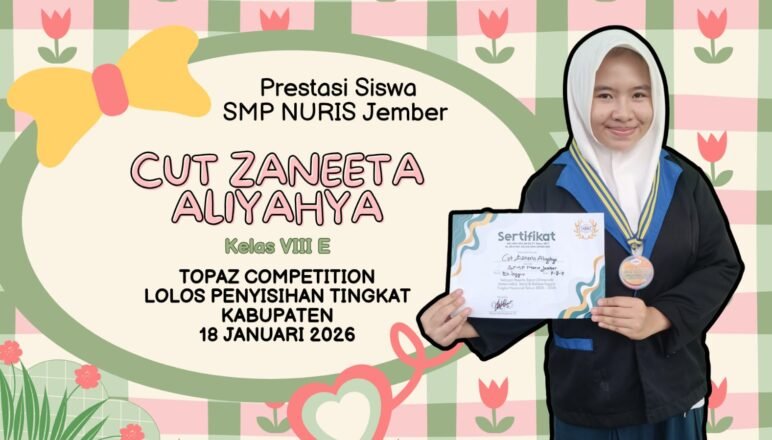 Prestasi16/03/2026 Siswi SMP Nuris Jember Cut Zaneeta Aliyahya Lolos Olimpiade Bahasa Inggris Tingkat Kabupaten TOPAS Nasional Belajar Tanpa Henti, Prestasi Setinggi Langit Pesantren Nuris — Di … Share