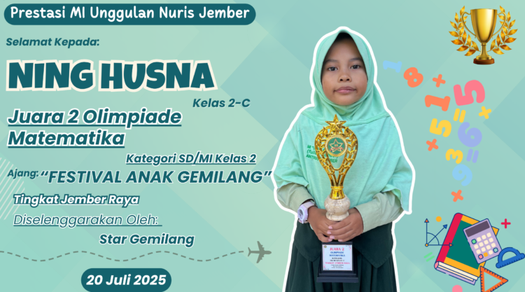 Pesantren Nuris – Kecerdasan dan ketekunan siswa-siswi MI Unggulan Nuris terus menorehkan tinta emas. Kali ini, Ning Husna dari Kelas 2-C kembali mengharumkan nama madrasah dengan meraih Juara 2 dalam Olimpiade Matematika Kategori SD/MI Kelas 2 di ajang “Festival Anak Gemilang” Tingkat Jember Raya.