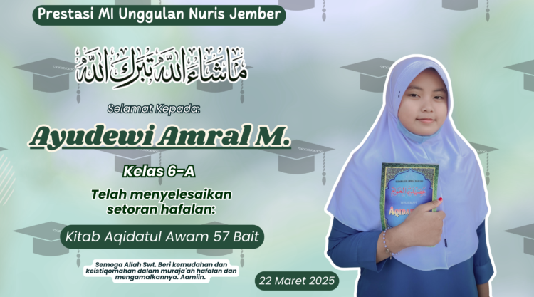 Gadis itu adalah Ayudewi Amral M., yang akrab dan lembut disapa Ayu. Dengan suaranya yang merdu dan sifatnya yang kalem, siswi kelas 6-A ini telah menyempurnakan setoran hafalan Kitab Aqidatul Awam sebanyak 57 bait. Pada tanggal 22 Maret 2025, lantunan syahdu syair-syair akidah darinya menjadi penutup yang manis, membuktikan bahwa ia telah menjaga amanah ilmu dengan sebaik-baiknya.