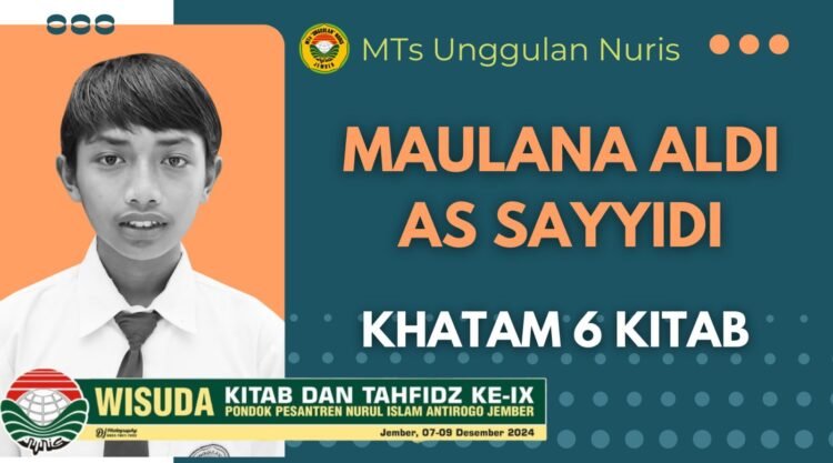 Pesantren Nuris – Lagi-lagi catatan mengagumkan berhasil diraih oleh siswa MTs Unggulan Nuris Jember, yakni Maulana Aldi As Sayyidi. Siswa yang lebih akrab disapa dengan panggilan Aldi ini merupakan siswa dari kelas IX-C MTs Unggulan Nuris Jember. Aldi ini adalah putra asli Jember, tepatnya berasal dari daerah Kalisat. Selama nyantri di Pesantren Nuris Jember ini, ia berhasil mengkhatamkan enam kitab selama kurun waktu tiga tahun. Pencapaian ini tentu menjadi dambaan bagi setiap santri, dan tentunya juga merupakan kebanggaan tersendiri bagi Aldi. Selain itu, keberhasilan yang ia gapai saat ini juga bisa dijadikan sebagai inspirasi dan motivasi bagi teman-temannya dalam belajar dan meraih kesuksesan.
