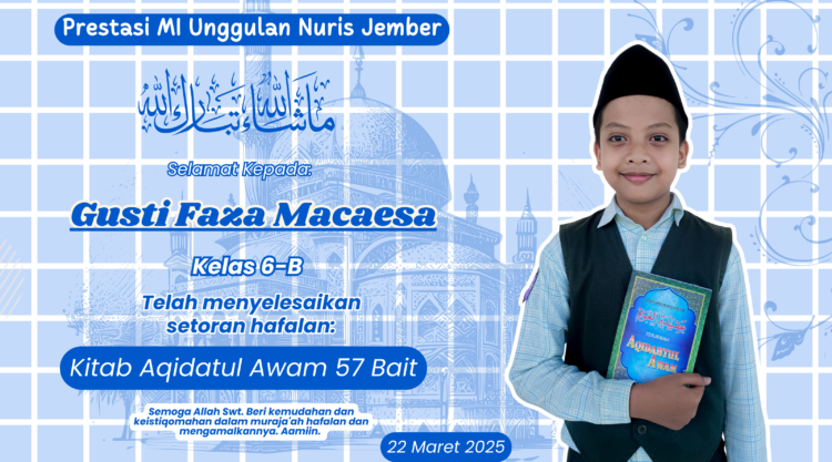 Ananda yang akrab disapa Faza ini telah menunjukkan hasil nyata dari kerja kerasnya selama ini. Siswa yang kini duduk di bangku kelas 6-B tersebut, pada tanggal 22 Maret 2025 lalu saat masih di kelas 5, berhasil menuntaskan sebuah pencapaian yang membanggakan. Dengan penuh keseriusan, ia sukses menyelesaikan setoran hafalan Kitab Aqidatul Awam sebanyak 57 bait, sebuah kitab dasar yang menjadi pilar penting dalam pemahaman akidah Islam.
