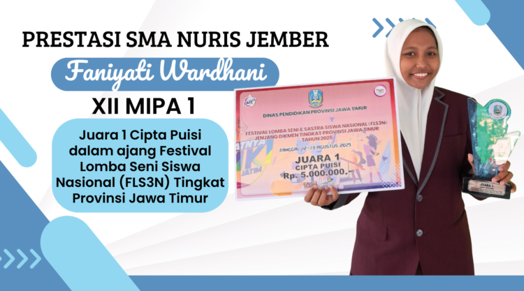 Pesantren Nuris – Bulan Agustus lalu menjadi bulan penuh bahagia bagi SMA Nuris Jember. Pasalnya salah satu siswi berprestasinya, Faniyati Wardhani, siswi kelas XII MIPA 1 SMA Nuris Jember, berhasil mengukir prestasi gemilang dengan meraih Juara 1 Cipta Puisi dalam ajang Festival Lomba Seni Siswa Nasional (FLS3N) Tingkat Provinsi Jawa Timur pada 13 Agustus 2025. Lomba yang diselenggarakan oleh Puspresnas Kemendikdasmen RI ini membuktikan bakat Fani dalam dunia sastra.