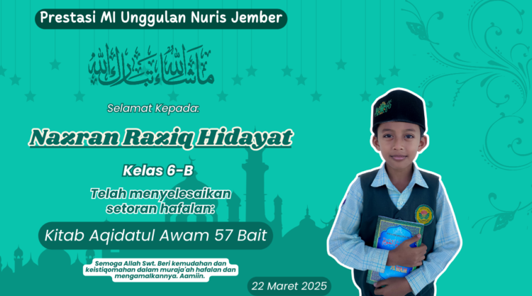 Siswa yang kini duduk di bangku kelas 6-B dan akrab disapa Nazran ini baru saja membuktikan bahwa di dalam ketenangannya, tersimpan sebuah tekad yang membanggakan. Pada tanggal 22 Maret 2025 lalu, saat masih di kelas 5, ia dengan gemilang telah berhasil menuntaskan setoran hafalan Kitab Aqidatul Awam sebanyak 57 bait.