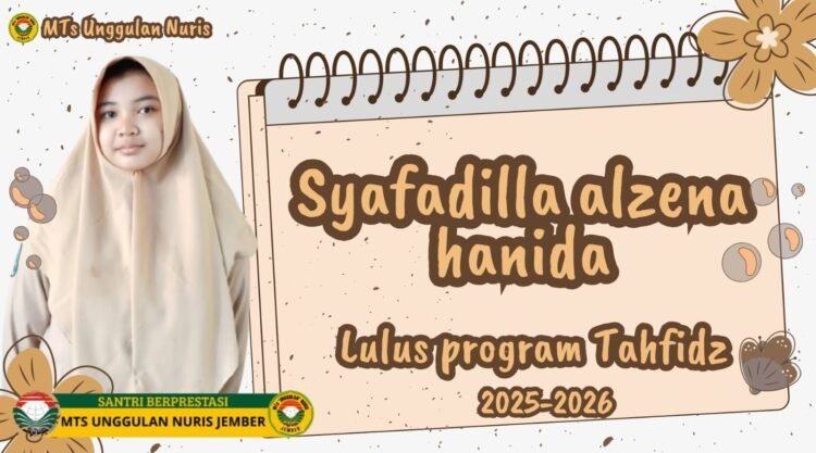 Pesantren Nuris – Prestasi membanggakan dari Syafadilla Alzena Hanida yang berhasil menuntaskan karantina program intensif kelas tahfidz MTs Unggulan Nuris Jember tahun ajaran 2025-2026. Nama Syafadilla resmi diumumkan sebagai salah satu peserta yang lulus, setelah melewati rangkaian pembinaan disiplin dan ujian hafalan yang digelar di lingkungan pesantren.