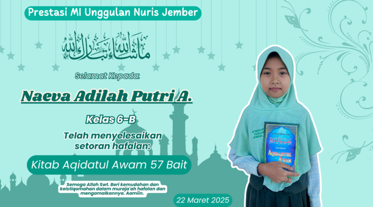 Siswi yang kini duduk di bangku kelas 6-B dan akrab disapa Naeva ini, telah berhasil memancarkan cahayanya melalui sebuah pencapaian yang sangat membanggakan. Pada tanggal 22 Maret 2025 lalu, ia dengan gemilang berhasil menuntaskan setoran hafalan Kitab Aqidatul Awam sebanyak 57 bait, sebuah prestasi yang menjadi bukti dari kekuatan hatinya yang tekun.