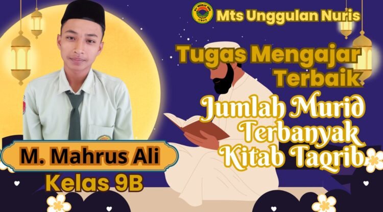 Pesantren Nuris – Menyampaikan ilmu yang telah diterima untuk disampaikan ke masyarakat merupakan misi yang sangat mulia. Memberikan pengajaran bukan hanya sekedar menyampaikan materi, tetapi juga memberi inspirasi dan motivasi kepada murid-murid dengan menggunakan metode pengajaran yang baik dan penjiwaan yang memadai, sehingga mampu mengkomunikasikannya dengan baik. Begitulah yang dilakukan oleh Mohammad Mahrus Ali, atau yang lebih dikenal dengan Mahrus, siswa kelas 9B MTs Unggulan Nuris, hingga meraih penghargaan Tugas Mengajar Terbaik Kategori Jumlah Murid Terbanyak Kitab Taqrib MDTM ULA NURIS 3.