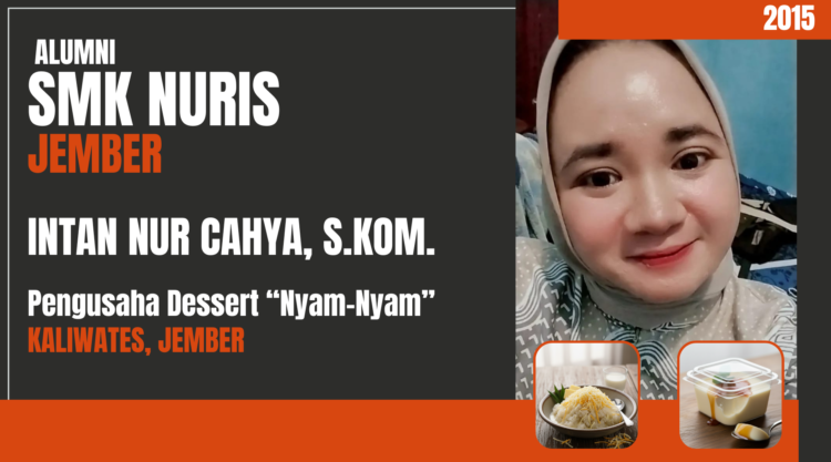 Pesantren Nuris – Berbekal semangat, kreativitas, dan hobi membuat kue, Intan Nur Cahya, S.Kom, alumni jurusan Teknik Komputer dan Jaringan (TKJ) SMK Nuris Jember tahun 2015, sukses merintis usaha makanan penutup yang ia beri nama Dessert Nyam Nyam. Meski baru berjalan sekitar empat bulan, usahanya telah memiliki banyak pelanggan setia, terutama di kawasan Kaliwates dan sekitarnya.