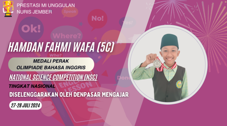 Pesantren Nuris –  Sepertinya tidak ada kamus kata ‘berhenti’ atau ‘cukup’ dalam perjalanan prestasi Hamdan Fahmi Wafa. Siswa fenomenal dari kelas 5C MI Unggulan Nuris Jember ini kembali membuktikan bahwa talentanya benar-benar tak terbatas. Setelah sukses menaklukkan panggung IPA, Matematika, dan IPS, kini ia melebarkan sayapnya dan berjaya di bidang Bahasa Inggris.