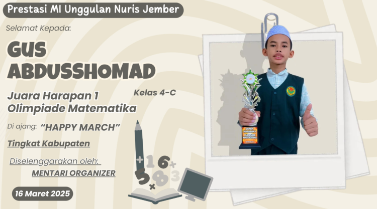 Pesantren Nuris – Panggung prestasi MI Unggulan Nuris Jember kembali bersinar terang, dan kali ini cahayanya datang dari arena olimpiade matematika. Seorang siswa muda penuh bakat, Gus Abdusshomad, berhasil membuktikan bahwa angka dan logika adalah sahabat baiknya. Gus Abdu sukses mengharumkan nama madrasah setelah berjuang gigih dalam kompetisi yang penuh tantangan.
