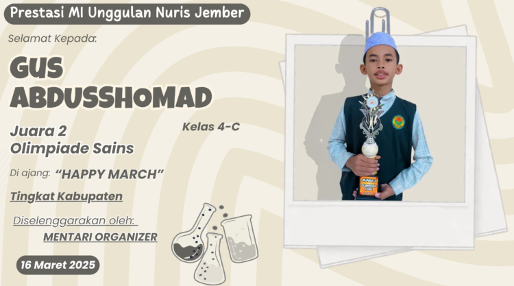 Masih dalam kemeriahan event “HAPPY MARCH” yang diselenggarakan oleh Mentari Organizer pada 16 Maret 2025 lalu, Gus Abdu berhasil meraih predikat Juara 2 dalam Olimpiade Sains tingkat Kabupaten. Prestasi ini menyusul keberhasilannya sebelumnya yang meraih Juara Harapan 1 di bidang Matematika. Memborong dua piala sekaligus dari dua bidang MIPA yang berbeda tentu sebuah pencapaian yang sangat langka dan membanggakan.