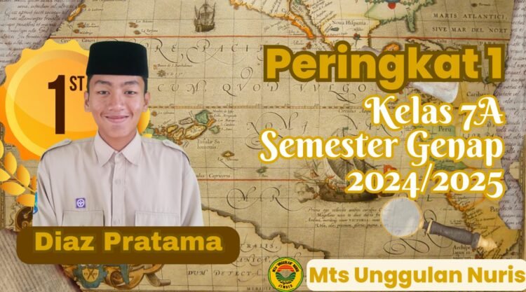Pesantren Nuris – MTs Unggulan Nuris kembali mencatat prestasi gemilang dengan keberhasilan Diaz Pratama, siswa kelas 7A, yang berhasil menduduki peringkat pertama di kelasnya pada semester genap tahun ajaran 2024/2025. Kesuksesan ini adalah bukti nyata dari ketekunan dan semangat belajar Diaz yang tinggi.