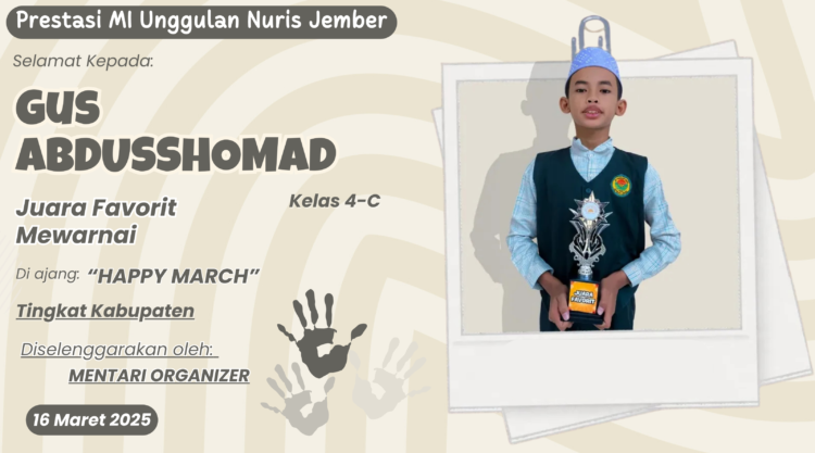 Pesantren Nuris – Rasanya kata ‘luar biasa’ belum cukup untuk menggambarkan rentetan prestasi yang diraih oleh Gus Abdusshomad. Setelah membuat semua orang berdecak kagum dengan kemampuannya di bidang matematika dan sains, siswa kelas 4-C MI Unggulan Nuris Jember ini kembali naik ke atas panggung juara, namun kali ini dari dunia yang penuh warna dan kreativitas, yaitu seni.