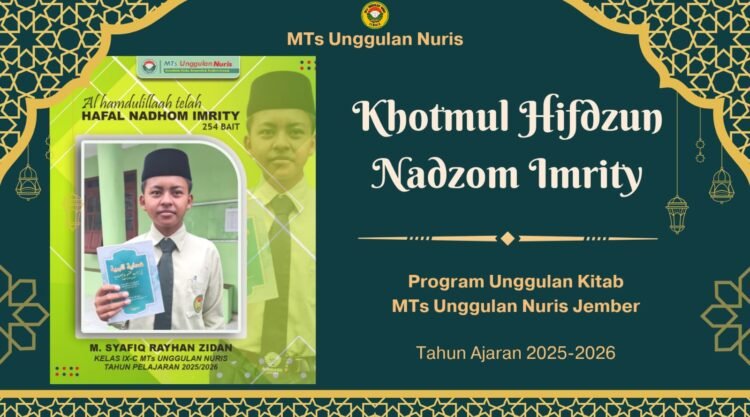 Pesantren Nuris – Seorang santri MTs Unggulan Nuris Jember berhasil menorehkan prestasi membanggakan dalam bidang keilmuan Islam. M. Syafiq Raihan Zidan, siswa kelas IX C, sukses mengkhatamkan hafalan Nadzom Imrity sebanyak 254 bait pada acara khotmil hifdzun yang digelar di lingkungan madrasah pada 15 September 2025.