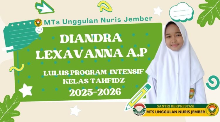 Pesantren Nuris – Tahun ajaran 2025/2026 di MTs Unggulan Nuris Jember kembali diwarnai kabar bahagia dari program unggulan tahfidz. Salah satu siswi, Diandra lexavanna A.P. , berhasil menyelesaikan masa karantina intensif tahfidz dengan hasil yang memuaskan. Karantina ini berlangsung selama beberapa bulan di awal tahun pelajaran, dirancang sebagai pembekalan bacaan dan hafalan Al-Qur’an sebelum peserta resmi masuk ke program tahfidz reguler.