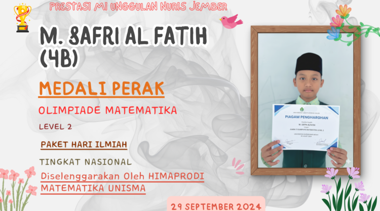 Pesantren Nuris – Panggung juara sepertinya tak pernah sepi dari nama M. Safri Alfatih. Si jagoan matematika dari kelas 4B MI Unggulan Nuris Jember ini lagi-lagi bikin bangga. Alfa, panggilan akrabnya, baru saja menambah koleksi medalinya dari salah satu kompetisi matematika paling bergengsi di tingkat nasional.
