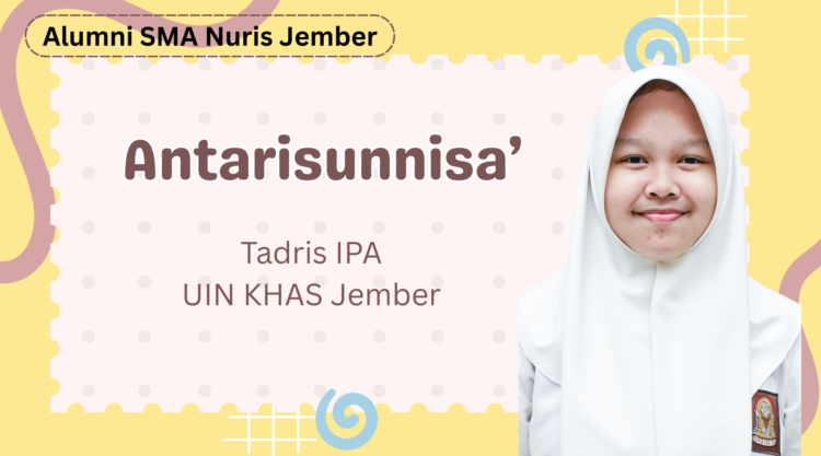 Pesantren Nuris – Antarisunnisa’, alumni SMA Nuris Jember angkatan 2025 yang berasal dari Jenggawah, Jember, berhasil melanjutkan pendidikan tinggi di UIN KHAS Jember pada Program Studi Tadris IPA, Fakultas Tarbiyah dan Ilmu Keguruan. Pilihan jurusan ini sesuai dengan latar belakangnya yang mengambil jurusan IPA saat SMA dan keinginannya meneruskan minatnya di bidang tersebut di kampus tercinta.