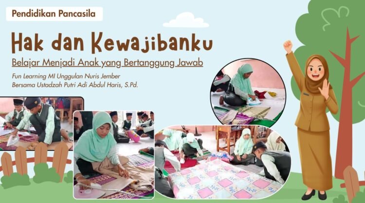 Pesantren Nuris – Kegiatan fun learning di MI Unggulan Nuris Jember kembali menghadirkan suasana belajar yang berbeda dan menyenangkan. Kali ini, giliran kelas 6C yang berkesempatan mengikuti pembelajaran seru bersama Ustadzah Putri Adi Abdul Haris, S.Pd. pada tanggal 19 Oktober 2025. Materi yang diangkat adalah “Hak dan Kewajiban Anak di Rumah”, dikemas dengan cara yang unik dan interaktif. Alih-alih hanya mendengarkan teori, para siswa justru diajak untuk mempraktikkan langsung kegiatan rumah tangga yang biasa dilakukan sehari-hari.