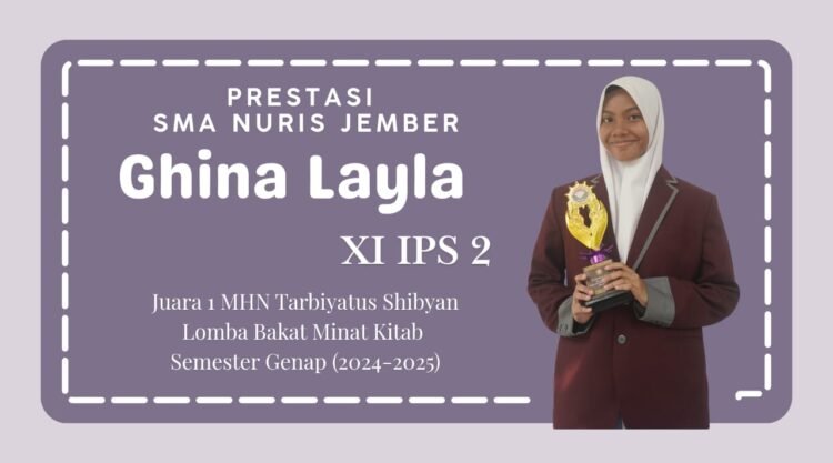 Ghina Layla, santriwati kelas 1A Mubtadi’at sekaligus siswi yang saat inintelah duduk di kelas XI IPS 2, SMA Nuris Jember, baru saja menambah daftar panjang prestasinya. Ia berhasil meraih Juara 1 MHN Kitab Tarbiyatus Shibyan dalam Lomba Bakat Minat Kitab semester genap tahun pelajaran 2024-2025 yang diadakan di Pesantren Nuris Jember. Prestasi ini melengkapi pencapaiannya di semester ganjil tahun pelajaran yang sama, di mana Ghina juga sukses meraih Juara 2 MHN Kitab Tarbiyatus Shibyan.