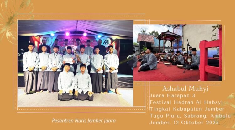 Pesantren Nuris – Ashabul Muhyi, tim hadrah santri Pesantren Nuris Jember tak pernah berhenti mengukir prestasi gemilang di setiap jejak kompetisi yang diikuti. Yang terbaru, mereka sukses bersaing dengan tim hadrah kategori umum se-Jember dalam Festival Hadrah Al Habsyi 2025 di Tugu Pluru, Sabrang-Sumberjo Ambulu, Jember pada Ahad, 12 Oktober 2025 kemarin.