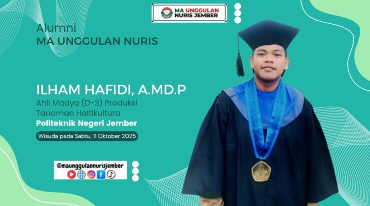 Pesantren Nuris – Santri cerdas dan berprestasi, Ilham Hafidi, akhirnya berhasil menuntaskan setahap proses pendidikan perguruan tinggi di kampus negeri vokasi, Politeknik Negeri Jember (POLIJE), usai diwisuda pada Sabtu, 11 Oktober 2025 kemarin. Gelar ahli madya pertanian (A.Md.P.) pun berhak disematkan di belakang namanya dengan rasa bangga dan bahagia.
