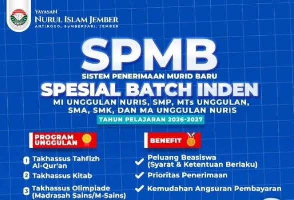 Tim Humas Yayasan Nurul Islam (Nuris) Jember telah meluncurkan kabar baik bagi calon santri yang siap diorbitkan meraih impian gemilangnya. Iya, SPMB jalur Spesial Batch Inden telah dibuka sejak berita ini diterbitkan hingga Desember 2025 mendatang. Hanya 2 bulan dengan kuota sangat terbatas yakni, 50 pendaftar tercepat di setiap lembaga, raih beragam benefit dan program unggulan yang ingin ditempuh.