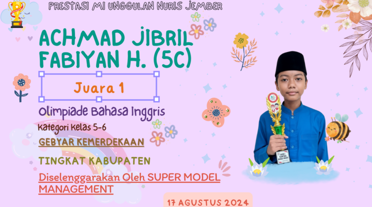 Pesantren Nuris – Nama Achmad Jibril Fabiyan H. dan panggung olimpiade Bahasa Inggris adalah dua hal yang seolah tak terpisahkan. Siswa multitalenta dari kelas 5C MI Unggulan Nuris Jember ini kembali menegaskan statusnya sebagai sang maestro bahasa dengan meraih podium tertinggi dalam sebuah kompetisi bergengsi tingkat kabupaten.
