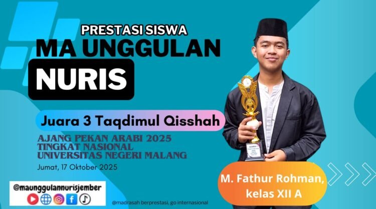 Pesantren Nuris – Boom October, jelang peringatan Hari Santri Nasional (HSN) tahun 2025, M. Fathur Rohman memberikan kado terindah dengan prestasi membanggakan di ajang Pekan Arabi 2025 tingkat nasional yang diselenggarakan oleh Universitas Negeri Malang pada Jumat, 17 Oktober 2025 kemarin. Pasalnya, ia berhasil meraih juara 3 usai berjibaku dengan ratusan peserta terbaik lainnya.