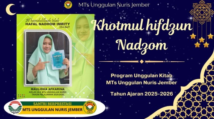 Pesantren Nuris – MTs Unggulan Nuris Jember kembali menorehkan prestasi melalui program unggulannya. Pada tahun ajaran 2025–2026, salah satu siswi, Maulidha Afkarina dari kelas IX H, berhasil menyelesaikan khatmul hifdzun nadzom Imrity. Maulidha dengan dukungan guru pembimbing program unggulan kitab di MTs Unggulan Nuris Jember mampu menuntaskan program hifdzun nadzom.