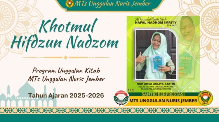 Pesantren Nuris – Program unggulan kitab di MTs Unggulan Nuris Jember tahun ajaran 2025–2026 kembali melahirkan capaian istimewa. Nur Ahda Aulia Ayatin, siswi kelas IX F, berhasil menuntaskan hafalan nadzom Imrity yang berjumlah 254 bait, sebuah pencapaian yang patut diapresiasi.