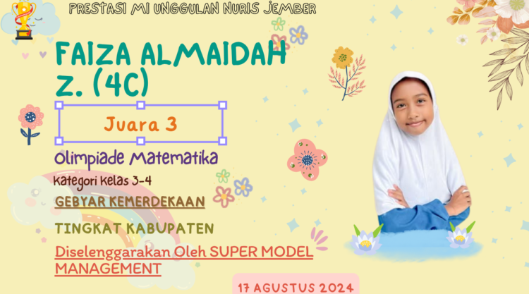 Dalam event “Gebyar Kemerdekaan” tingkat Kabupaten yang diselenggarakan oleh Super Model Management pada 17 Agustus 2024 lalu, Faiza kembali menegaskan dominasinya dengan meraih Juara 3 dalam Olimpiade Matematika untuk kategori kelas 3-4.