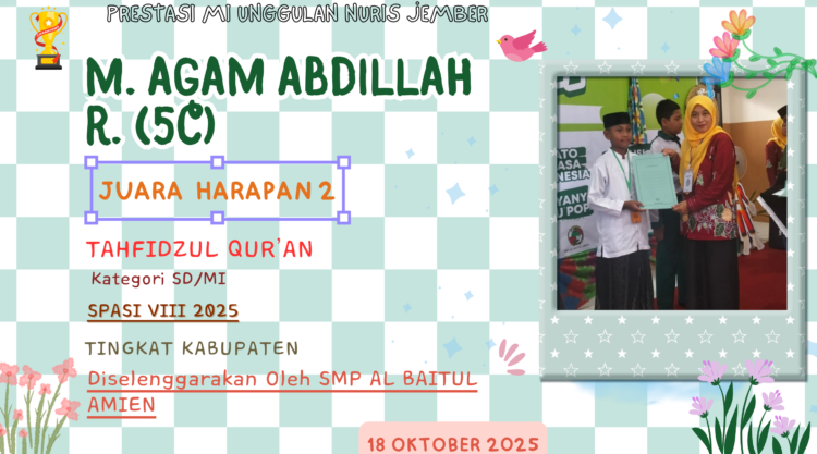 Agam merupakan cerminan indah dari komitmen MI Unggulan Nuris Jember dalam mencetak generasi Qur’ani yang berprestasi. Sekolah terus memberikan dukungan penuh bagi para siswa seperti Agam untuk mengembangkan bakat mereka di bidang keagamaan, menyeimbangkan antara ilmu dunia dan akhirat.