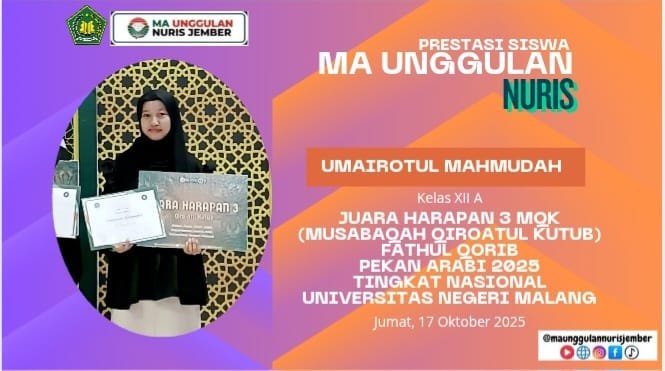 Santri cerdas yang duduk di kelas XII A MA Unggulan Nuris ini tak bisa menyembunyikan rasa bangga dan bahagianya usai dinobatkan sebagai peraih juara harapan 3. Setelah perjuangan bersaing ketat dengan ratusan peserta dari berbagai lembaga pendidikan se-Indonesia yang turut serta dalam Pekan Arabi 2025 ini, Umai, sapaan akrabnya, harus puas dengan capaian prestasi membanggakan ini.