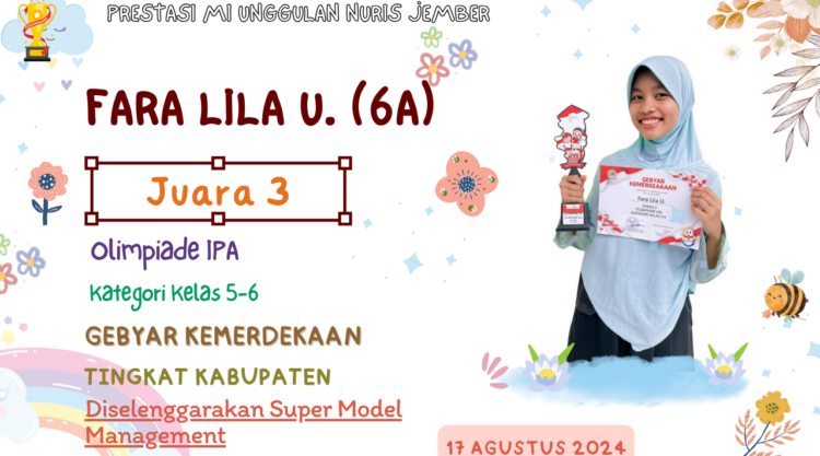 Pesantren Nuris – Rasanya, panggung juara di Kabupaten Jember belum lengkap jika nama Fara Lila U. tidak disebut. Siswi legendaris dari kelas 6A MI Unggulan Nuris Jember ini kembali menunjukkan dominasi mutlaknya dengan tidak hanya membawa satu, tetapi dua piala sekaligus dari ajang yang sama.