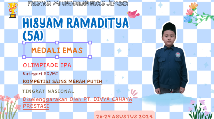 Pesantren Nuris – Ada nama-nama yang ketika disebut, kita langsung teringat pada satu bidang keahlian. Dan untuk bidang sains di MI Unggulan Nuris Jember, nama itu adalah Hisyam Ramaditya. Siswa fenomenal dari kelas 5A ini akhirnya berhasil meraih pencapaian puncak yang telah lama ia perjuangkan. Medali emas di tingkat nasional!