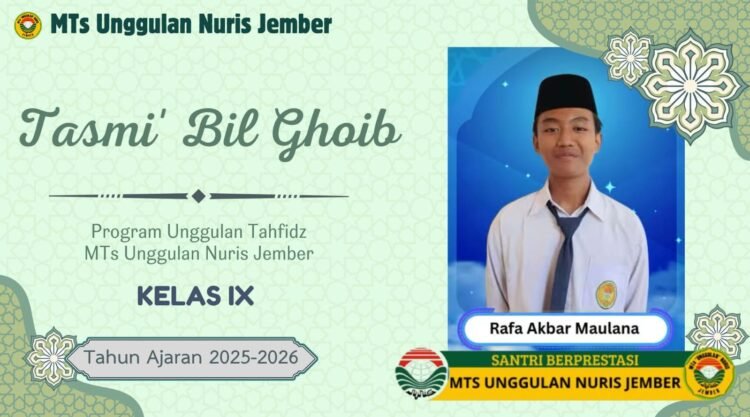Pesantren Nuris – Salah satu siswa MTs Unggulan Nuris Jember, Rafa Akbar Maulana Maharani dari kelas IX, berhasil menuntaskan tasmi’ bil ghoib 1 juz dalam Program Unggulan Tahfidz MTs tahun pelajaran 2025–2026. Kegiatan ini menjadi bagian dari upaya madrasah dalam mencetak generasi yang cinta dan hafal Al-Qur’an.