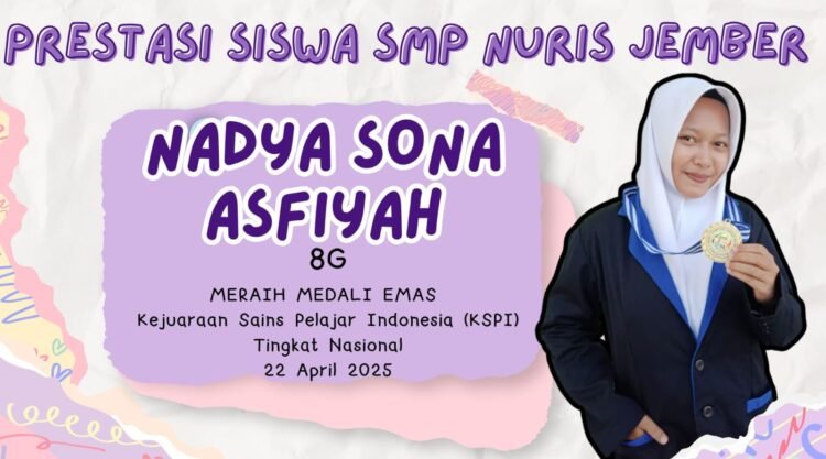 Pesantren Nuris — Kabar bahagia kembali berhembus dari lingkungan SMP Nuris Jember. Kali ini datang dari Nadya Sona Asfiyah, siswi kelas VIII G, yang berhasil menorehkan prestasi membanggakan di ajang Kejuaraan Sains Pelajar Indonesia (KSPI) yang digelar pada 22 April 2025 lalu. Dalam ajang bergengsi yang diadakan oleh Generasi Maju Indonesia (GEMANESIA) ini, Nadya sukses menyabet Medali Emas Olimpiade IPA tingkat nasional, mengukuhkan namanya di deretan pelajar berprestasi Tanah Air.