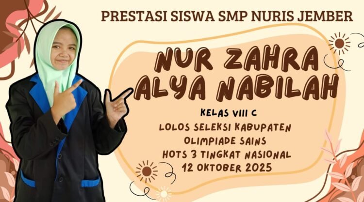 Pesantren Nuris — Deretan prestasi SMP Nuris Jember kembali bertambah lewat capaian luar biasa dari siswi cerdas dan tekun bernama Nur Zahra Alya Nabilah, atau akrab disapa Zahra. Siswi kelas VIII C ini sukses lolos dalam Olimpiade Sains HOTS 3 Tingkat Nasional bidang IPA setelah melalui seleksi tingkat Kabupaten Jember yang digelar pada 12 Oktober 2025 di SDN Kepatihan 3 Jember.