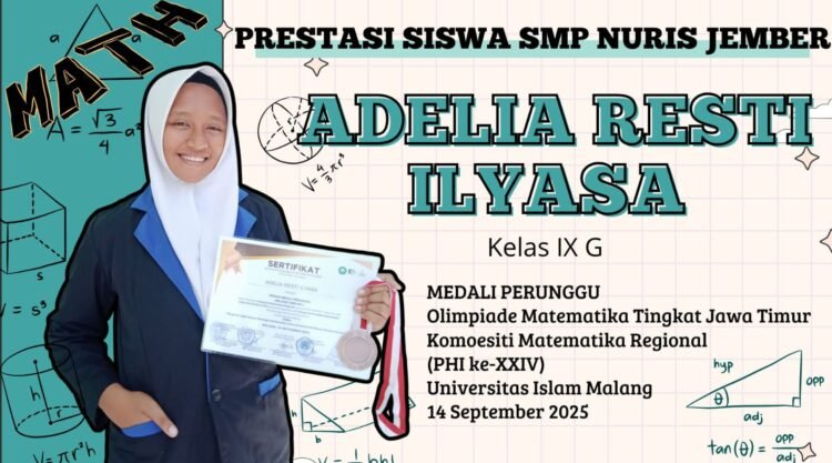 Pesantren Nuris — Langit keberhasilan kembali menaungi SMP Nuris Jember lewat torehan prestasi membanggakan dari salah satu siswinya, Adelia Resti Ilyasa, kelas IX G. Gadis yang akrab disapa Resti ini sukses menorehkan tinta emas dalam sejarah sekolahnya dengan meraih Medali Perunggu Olimpiade Matematika Tingkat Jawa Timur dalam ajang bergengsi Kompetisi Matematika Regional (PHI ke-XXIV) yang diselenggarakan oleh Universitas Islam Malang pada 14 September 2025.