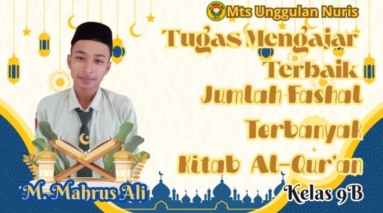 Pesantren Nuris – Mohammad Mahrus Ali, atau yang akrab disapa Mahrus, adalah salah satu siswa kelas 9B MTs Unggulan Nuris yang telah menunjukkan prestasi gemilang dengan berhasil meraih penghargaan Tugas Mengajar Terbaik dengan kategori Jumlah Fashal Terbanyak Kitab Al-Qur’an MDTM ULA NURIS 3. Prestasi ini merupakan bukti nyata dari kesungguhan dan ketekunan Mahrus dalam mempelajari dan mengamalkan ajaran Islam.