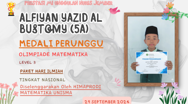 Pesantren Nuris – Panggung juara sepertinya tak pernah sepi dari nama M. Safri Alfatih. Si jagoan matematika dari kelas 4B MI Unggulan Nuris Jember ini lagi-lagi bikin bangga. Alfa, panggilan akrabnya, baru saja menambah koleksi medalinya dari salah satu kompetisi matematika paling bergengsi di tingkat nasional.