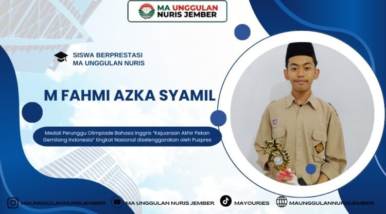 Pesantren Nuris — M Fahmi Azka Syamil, siswa kelas XI E MA Unggulan Nuris yang akrab disapa Fahmi, kembali menorehkan pencapaian membanggakan dengan berhasil meraih Medali Perunggu dalam Olimpiade Bahasa Inggris “Kejuaraan Akhir Pekan Gemilang Indonesia” tingkat Nasional yang diselenggarakan oleh Puspres. Prestasi ini menjadi bukti bahwa kerja keras dan kemauan untuk berkembang mampu membawa seseorang menembus batas kemampuan diri. Fahmi dikenal sebagai sosok yang pendiam namun tekun, memiliki hobi membaca yang membuatnya memiliki wawasan luas dan pola pikir yang matang. Dengan cita-cita besar ingin menjadi direktur yayasan, ia terus melatih diri agar mampu membangun karakter dan kualitas yang dibutuhkan untuk masa depan.