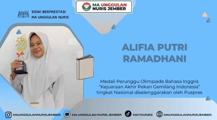 Pesantren Nuris — Alifia Putri Ramadhani, siswi kelas XI E MA Unggulan Nuris Jember, kembali menorehkan nama baik lembaganya melalui prestasi membanggakan di tingkat nasional. Gadis yang akrab disapa Fia ini berhasil meraih Medali Perunggu dalam Olimpiade Bahasa Inggris “Kejuaraan Akhir Pekan Gemilang Indonesia” yang diselenggarakan oleh Puspres. Pencapaian ini menjadi salah satu langkah berharga bagi Fia yang selama ini dikenal sebagai sosok pelajar tekun, penyuka menulis, serta gemar berhitung.