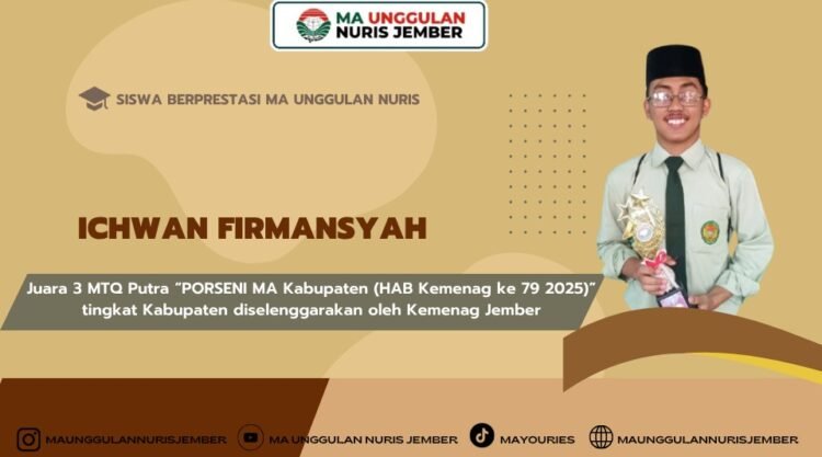 Pesantren Nuris — Prestasi membanggakan kembali diraih oleh salah satu siswa berbakat MA Unggulan Nuris Jember. Ichwan Firmansyah, siswa kelas XI B yang berasal dari Jatiroto, Lumajang, berhasil meraih Juara 3 Musabaqah Tilawatil Qur’an (MTQ) Putra dalam ajang PORSENI MA Kabupaten yang merupakan rangkaian kegiatan dalam memperingati Hari Amal Bakti Kementerian Agama ke-79 Tahun 2025. Kompetisi yang diselenggarakan oleh Kantor Kementerian Agama Kabupaten Jember ini mempertemukan para peserta terbaik dari berbagai madrasah di wilayah tersebut, dan Ichwan menjadi salah satu dari sedikit peserta yang mampu naik podium, membawa harum nama madrasah.