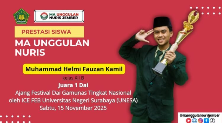 Pesantren Nuris – Muhammad Helmi Fauzan Kami kembali membanggakan keluarga besar Pesantren Nuris Jember, khususnya almamater MA Unggulan Nuris usai berhasil meraih juara 1 dai tingkat nasional dalam ajang Festival Dai GAMUNAS 2025 yang diselenggarakan oleh ICE FEB UNESA (Universitas Negeri Surabaya) pada Sabtu, 15 November 2025 kemarin.