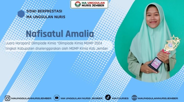 Pesantren Nuris — Nafisatul Amalia, siswi kelas XII E MA Unggulan Nuris yang akrab disapa Nafisatul atau Atul, kembali menorehkan prestasi membanggakan melalui ajang Olimpiade Kimia MGMP 2024 tingkat Kabupaten Jember yang diselenggarakan secara resmi oleh MGMP Kimia Kabupaten Jember. Dalam kompetisi yang diikuti ratusan peserta dari berbagai sekolah menengah atas dan madrasah aliyah di seluruh Kabupaten Jember ini, Atul berhasil meraih Juara Harapan 2, sebuah pencapaian yang tidak hanya meningkatkan kepercayaan dirinya, tetapi juga mengukuhkan posisi MA Unggulan Nuris sebagai sekolah yang konsisten melahirkan generasi berprestasi di bidang sains, khususnya kimia. Pencapaian ini sekaligus memperlihatkan bahwa semangat, kerja keras, dukungan dari orang-orang di sekitar, serta pembinaan yang tepat dapat membuka jalan bagi siswa untuk meraih prestasi yang mungkin sebelumnya tidak terpikirkan.