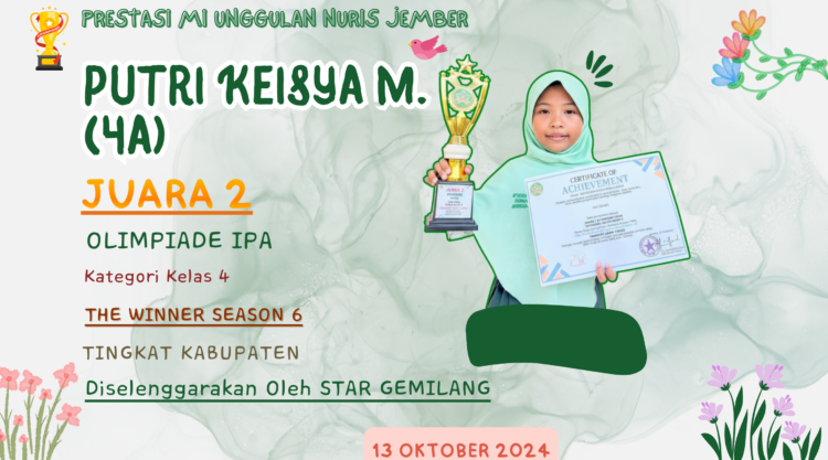 Dunia prestasi MI Unggulan Nuris Jember telah resmi menyambut bintang baru. Dengan dua piala di tangan, Putri Keisya telah menulis babak pertamanya dengan tinta emas. Kita semua tentu tidak sabar untuk melihat kejutan-kejutan apalagi yang akan ia persembahkan di masa depan.