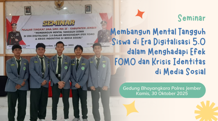 Pesantren Nuris – Lima anggota OSIS SMK Nuris Jember berkesempatan menghadiri seminar bersama Polres Jember bertajuk “Membangun Mental Tangguh Siswa di Era Digitalisasi 5.0 dalam Menghadapi Efek FOMO dan Krisis Identitas di Era Media Sosial”. Acara yang berlangsung di Gedung Bhayangkara Polres Jember pada Kamis, 30 Oktober 2025 ini diikuti oleh perwakilan pelajar dari berbagai SMA, MA, dan SMK se-Kabupaten Jember.