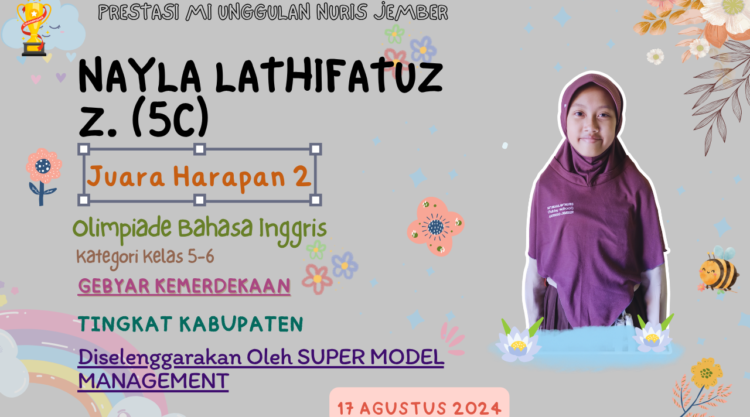 Nayla, sapaan akrabnya, berhasil menorehkan prestasi membanggakan dengan meraih Juara Harapan 2 dalam Olimpiade Bahasa Inggris untuk kategori kelas 5-6. Prestasi ini ia raih dalam event “Gebyar Kemerdekaan” tingkat Kabupaten yang diselenggarakan oleh Super Model Management pada 17 Agustus 2024 lalu.