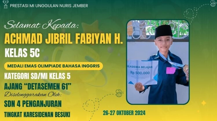Kali ini, Jibril berhasil menaklukkan ajang bergengsi “DETASEMEN 61” tingkat Karesidenan Besuki. Dalam kompetisi yagn diselenggarakan oleh SDN 4 Penganjuran pada 26-27 Oktober 2024 tersebut, Jibril tampil dominan dan sukses menyabet Medali Emas untuk Kategori Olimpiade Bahasa Inggris.