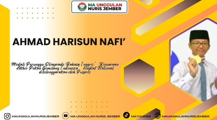 Pesantren Nuris — Ahmad Harisun Nafi’, siswa kelas XI E MA Unggulan Nuris, kembali menjadi salah satu wajah inspiratif di lingkungan madrasah setelah berhasil mengukir prestasi membanggakan pada ajang Olimpiade Bahasa Inggris “Kejuaraan Akhir Pekan Gemilang Indonesia” tingkat nasional yang diselenggarakan oleh Puspres. Remaja yang akrab dipanggil Haris ini dikenal sebagai sosok tenang yang memiliki ketertarikan tinggi pada dunia bahasa dan kepenulisan. Meski berasal dari lingkungan yang sederhana, kecintaannya terhadap proses belajar tidak pernah padam. Hobi menulis yang ia tekuni sejak lama tidak hanya melatih ketajaman berpikir, tetapi juga memperkaya perbendaharaan bahasanya hingga membuatnya semakin percaya diri terjun ke kompetisi yang diikuti siswa-siswa berprestasi dari berbagai penjuru daerah. Dengan tekad kuat dan impian besar untuk menjadi seorang guru di masa depan, Haris memandang setiap tantangan sebagai bagian penting dari perjalanan panjang menuju cita-cita yang ia yakini sebagai jalan bakti bagi keluarga dan lembaganya.